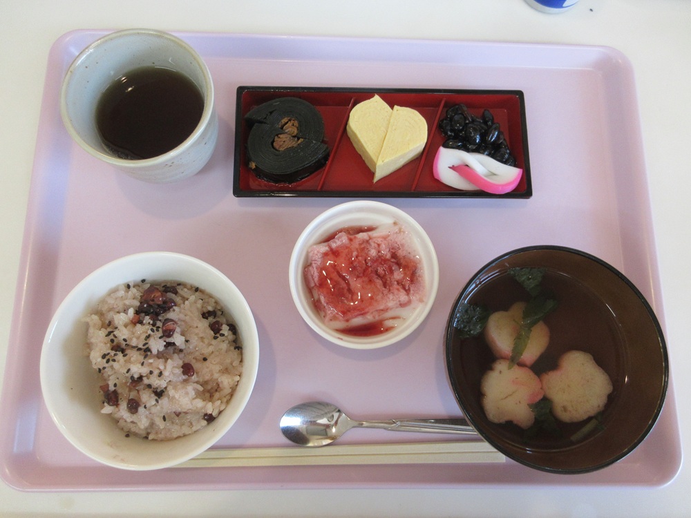 お赤飯・お吸い物・昆布巻き・黒豆・かまぼこ・だし巻き卵・イチゴババロア