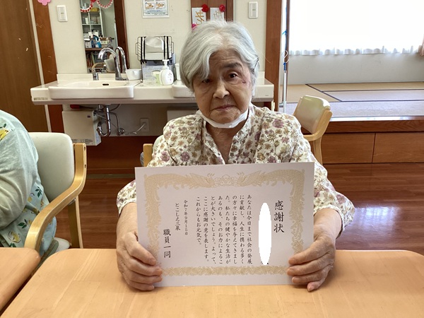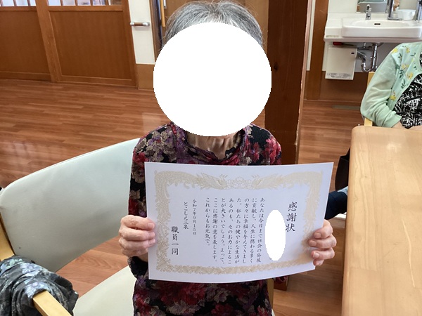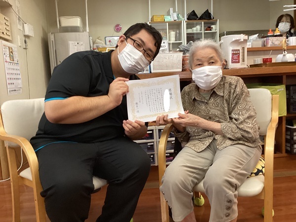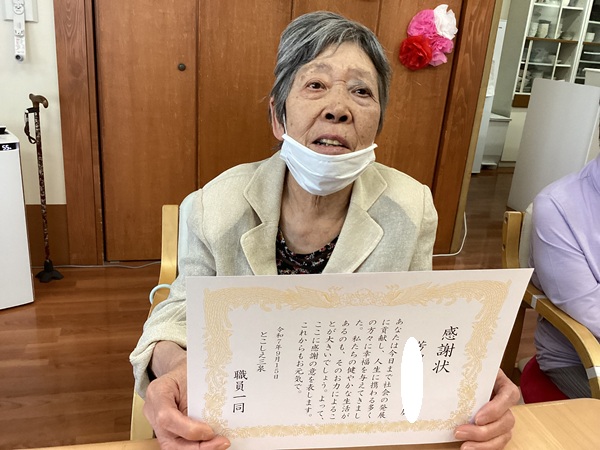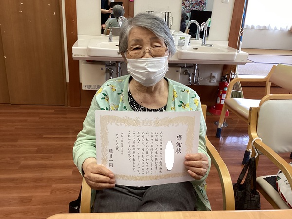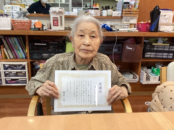 皆様を代表いたしまして、この日の利用者様の最高齢の方が授与されました☺