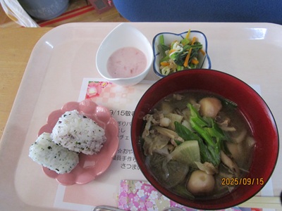 メニューは、おにぎり・いも煮・野菜タップリおひたし・フルーチェです🥢