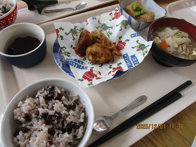 赤飯、豚汁、麩の揚げ物、厚揚げの煮物、ゼリーです!!