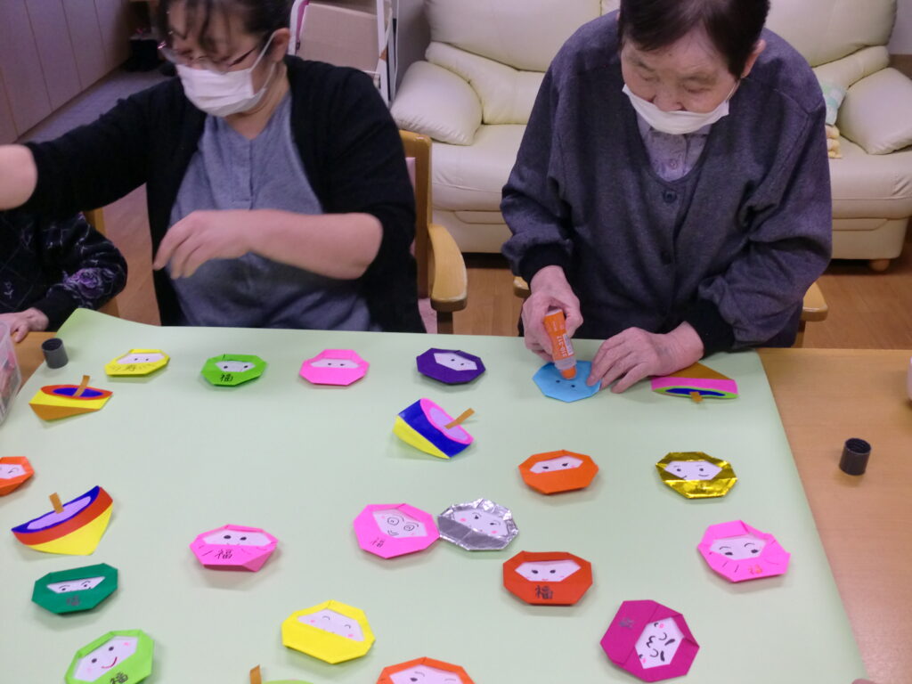 折り紙で作ったダルマに皆様から顔を書いていただいたり、コマ作りを行いました。