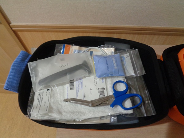 AEDの入ったバッグを開くと中にAED本体とハサミや予備のAEDのパッドが入った袋が入っております。