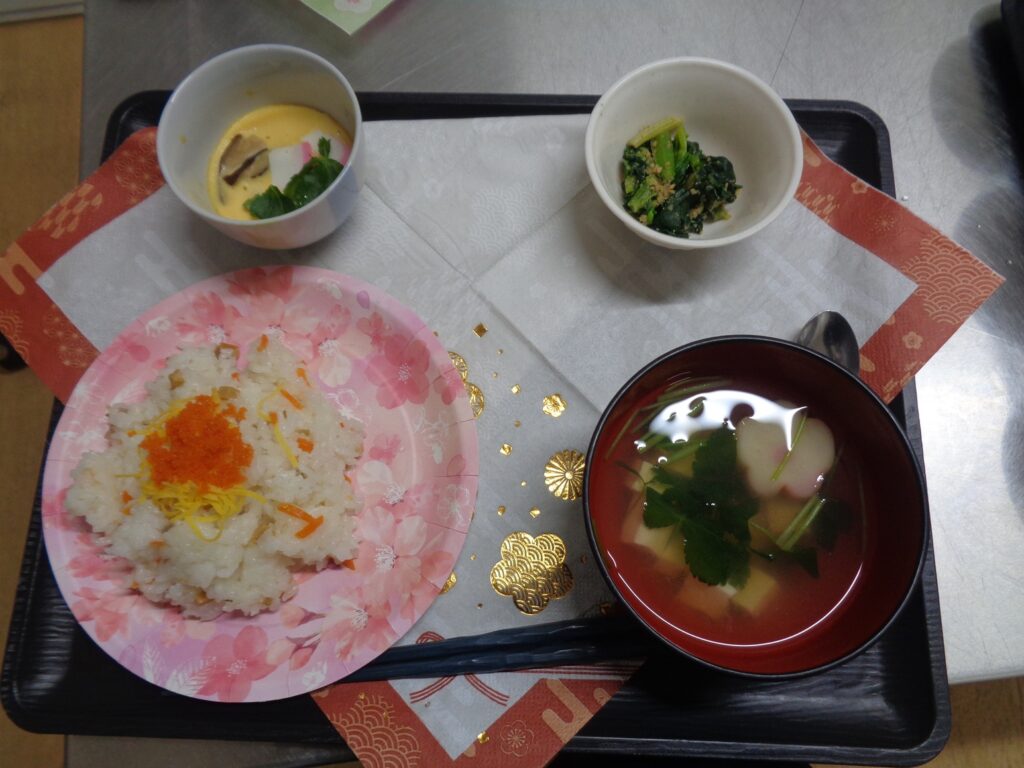ちらし寿司、お吸い物、茶わん蒸し、ほうれん草のごま和えです✨