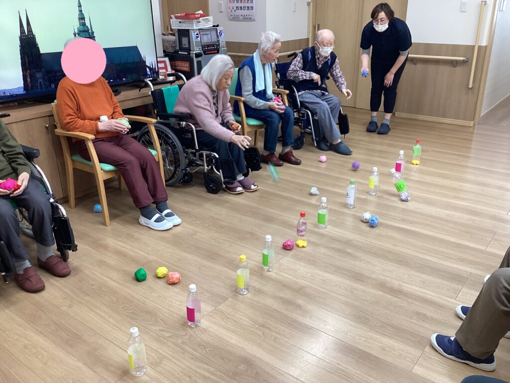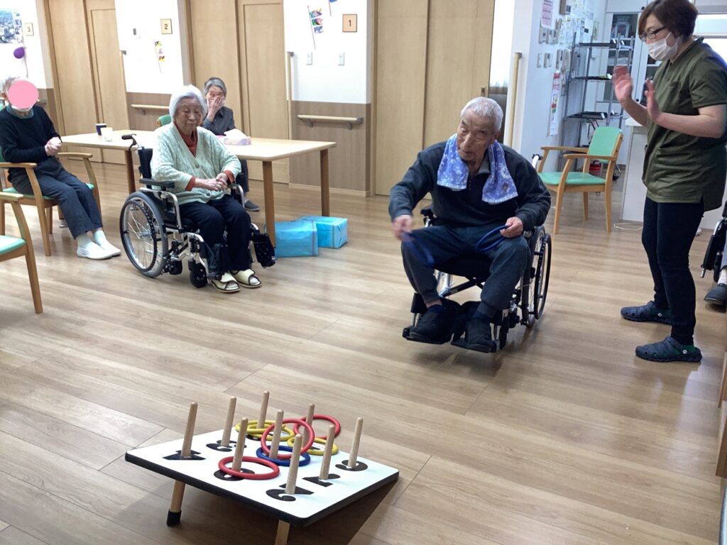 輪投げとペットボトル倒しゲームの様子です✨特に輪投げはバランス能力の向上が期待でき、とこしえ新庄金沢で人気のレクリエーションです!!