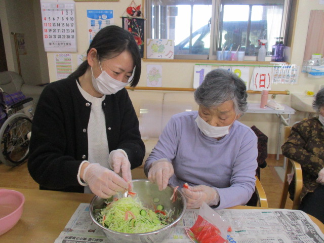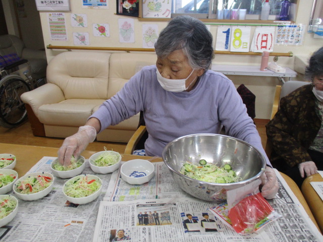 カニカマをほぐしてもらい、盛り付けをしていただきました。