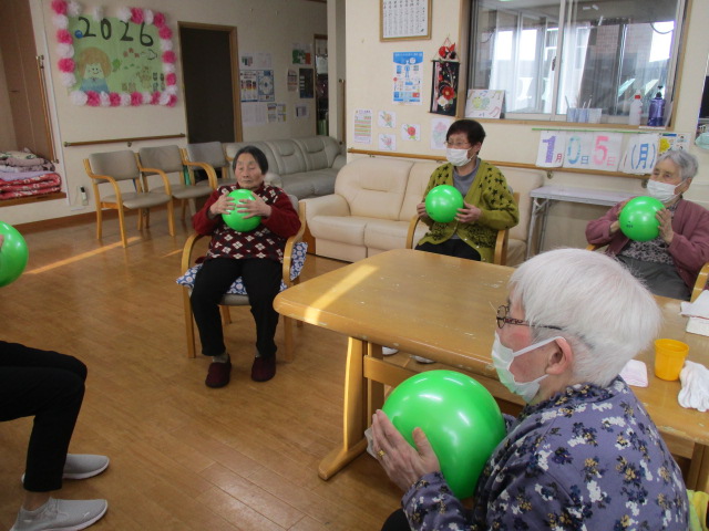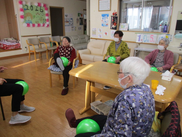 毎日音楽体操などで楽しく体を動かしていますが、この日は機能訓練指導員の先生と一緒に、寒さ🥶でこわばっている体をボールを使い動かしています!