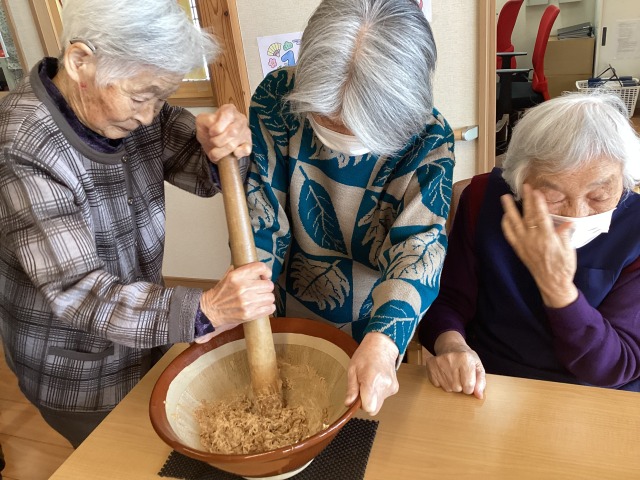 みなさんで協力しながら、納豆をすり鉢で潰しました!