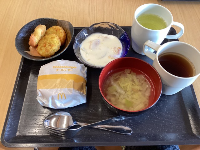 昼食は、マクドナルドのチーズバーガー🍔をテイクアウトしてきました!