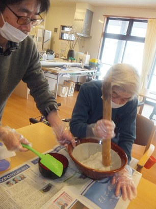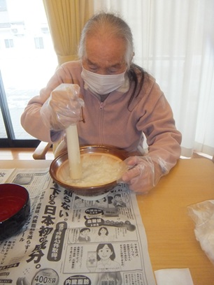 もち米を炊いたら、すりこ木で程よくつぶすように混ぜていきます!