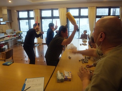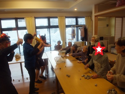 みなさん頑張って下さい!今回投げている豆は事前に皆さんから丸めて頂いた新聞紙を使っています。