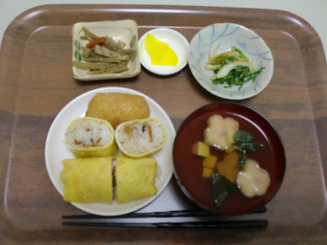 ・恵方巻 いなり寿司 お吸い物 アサツキの酢味噌和え 金平ごぼう 漬物