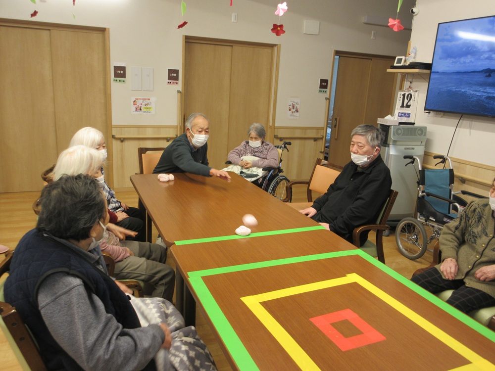 日々のレクリェーションの様子です、お手玉投げと輪投げ…とても上手で皆さん投げるのは得意です💦