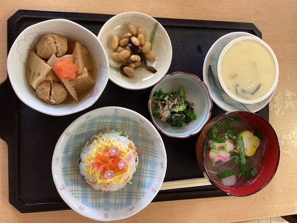 昼食には特別メニューでちらし寿司ケーキや菜の花のお浸し、はまぐりお吸い物など春メニューを召し上がって頂きました😆🙌