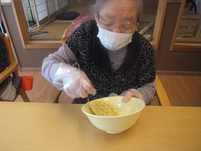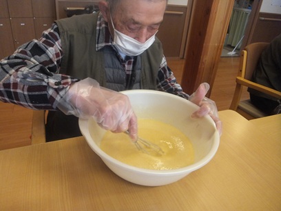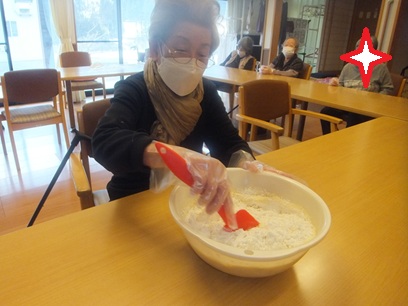 おやつレクの様子です♪こちらは生地作りの様子です。お客様方からも手伝って頂き