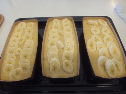生地を型に流し込み、そこに薄く切ったバナナをトッピング♪