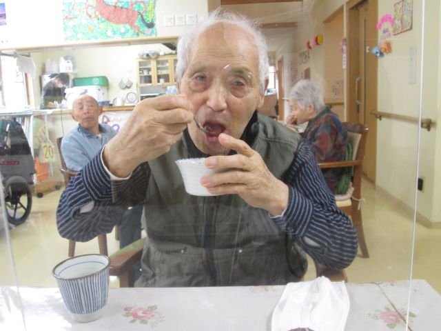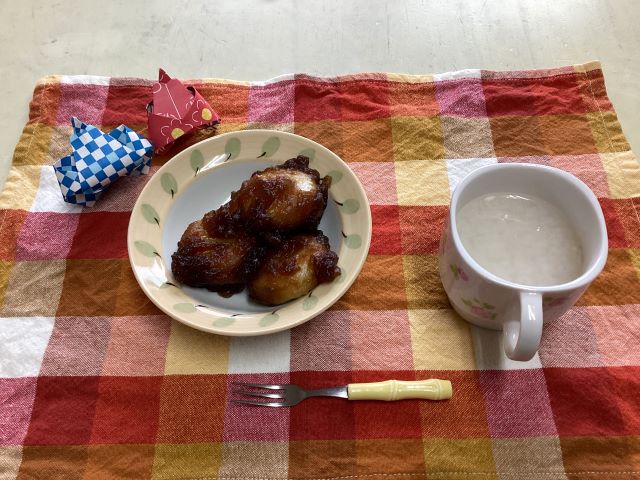 おやつでは、甘酒とあんこ団子を提供し、「甘ごいな大好きだ」