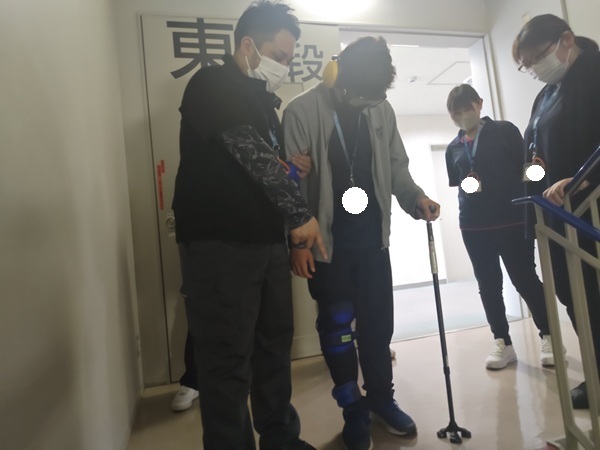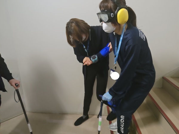 実際に高齢者の疑似体験を行い、階段の上り下りを行いました。